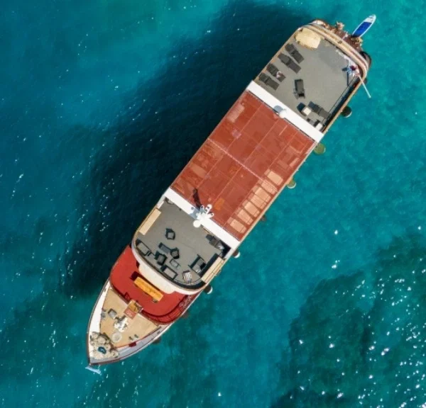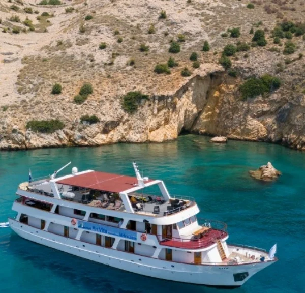 Sonstiges: Sonnendeck (200 m²) mit 30 Sonnenliegen und 10 Liegestühlen, Badeplattform mit Duschen am Heck. Salon mit Klimaanlage für 38 Personen auf dem Oberdeck, Tische mit Bänken und Stühlen für 38 Personen auf dem überdachten Oberdeck hinter dem Salon, das witterungsabhängig mit Planen verschlossen werden kann. Tägliche Kabinenreinigung und Handtuchwechsel.